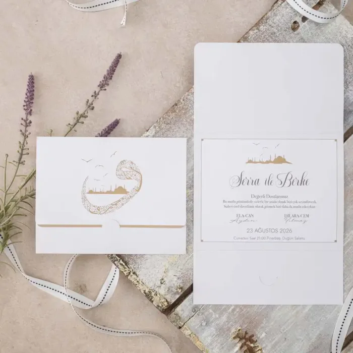 • Davetiye kutulu olarak tasarlanmış olup zarf ve aksesuarları içerisinde bulunmaktadır.